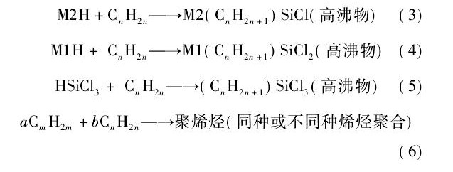 由于低沸物中除含有Me4Si、M2H、MH外, 還含有同分異構(gòu)體的戊烯、異丁烷等其它雜質(zhì), 因此也存在如式3~式6的反應(yīng)。